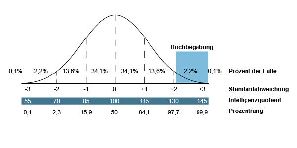 Traditionell werden Menschen als „hochbegabt“ bezeichnet, die in einem Intelligenztest einen Intelligenzquotienten (IQ) von 130 bzw. einen Prozentrang von 97,7 und höher erreichen. Der Prozentrang gibt dabei an, wie viel Prozent der Vergleichsgruppe gleich große oder kleinere Werte erzielt. Ein Prozentrang von 97,7 bedeutet beispielsweise, dass nur 2,3 Prozent der gleichaltrigen Kinder gleich große oder bessere Werte erzielt, d.h. dass das Kind zu den 2,3 Prozent der Besten gehört. Ein Prozentrang von 50 kennzeichnet ein durchschnittliches Ergebnis. Nach dieser Definition sind zwei bis drei Prozent der Bevölkerung als hochbegabt zu bezeichnen.